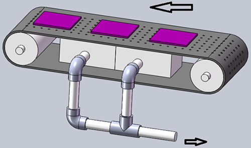 在我们的工业化流水线中,有很多产品都合适于真空吸附式来达到连续运载产品的目的,当一种容易滑落、或是质量较轻的薄片(带)产品在连续传送过程中,利用钢带下部的真空,将所需传送的物品通过有孔的钢带吸附或固定在规定的位置。